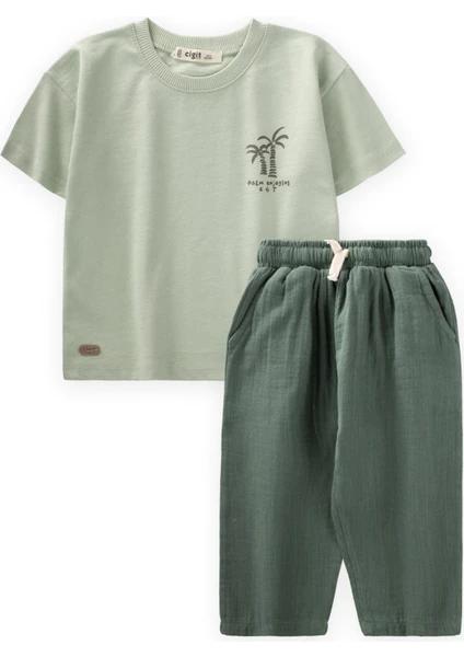 Cigit Organik Şalvarlı Palmiye Baskılı T-Shırt Takım 1-5 Yaş Su Yeşili