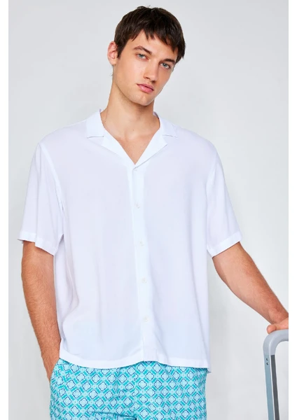 Viskon kumaştan yapılmış, beyaz, düz renkli, kısa kollu, apaş yakalı, normal kesim (regular fit) bir erkek gömleği; yazlık kullanım için idealdir.