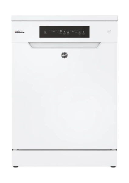 Bu, beyaz renkli, bağımsız bir Hoover bulaşık makinesidir. HF 3C7L0W-80 model numaralı bu bulaşık makinesi, 13 kişilik yemek takımı kapasitesine sahiptir. Çeşitli simgeler içeren bir kontrol paneli bulunmaktadır; bu da birden fazla yıkama programı ve muhtemelen Wi-Fi bağlantısı olduğunu göstermektedir.